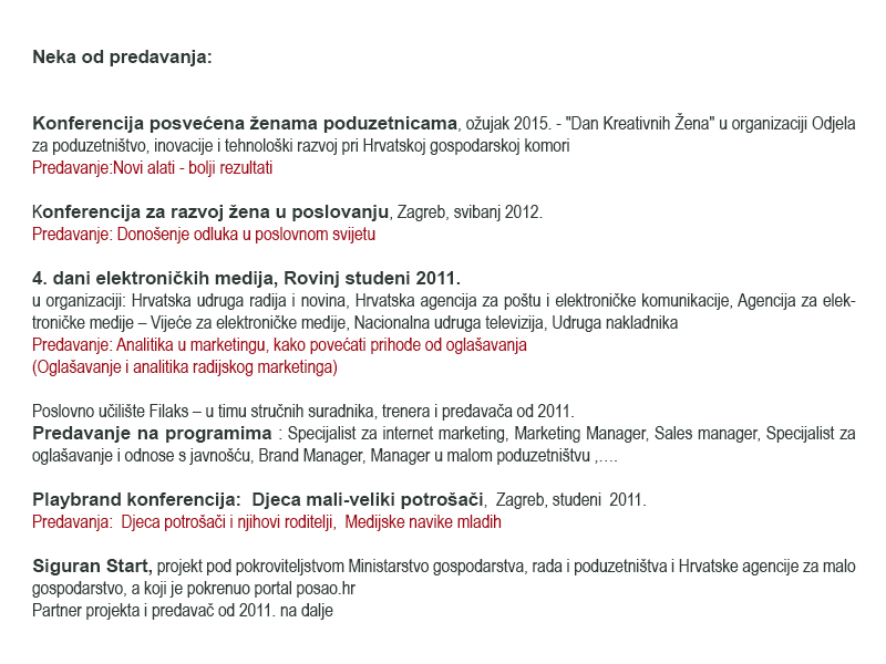 Javni nastupi na konferencijama, seminarima i sl.: Weekwnd Media Festival, Dani elektroničkih medija, SEMPL, ...
